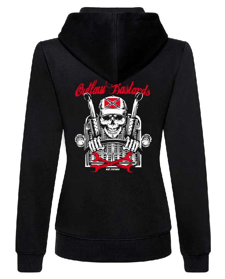100% bavlněná černá dámská mikina Outlaw Bastards na zip s kapucou, vpředu kapsa "klokanka".