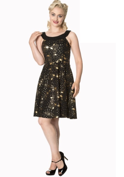 Dámské stylové černozlaté elastické šaty značky Banned, retro, rockabilly, pin-up, motiv hvězdný, mystický, planety, hvězdy. Z boku zip pro snadnější oblékání.